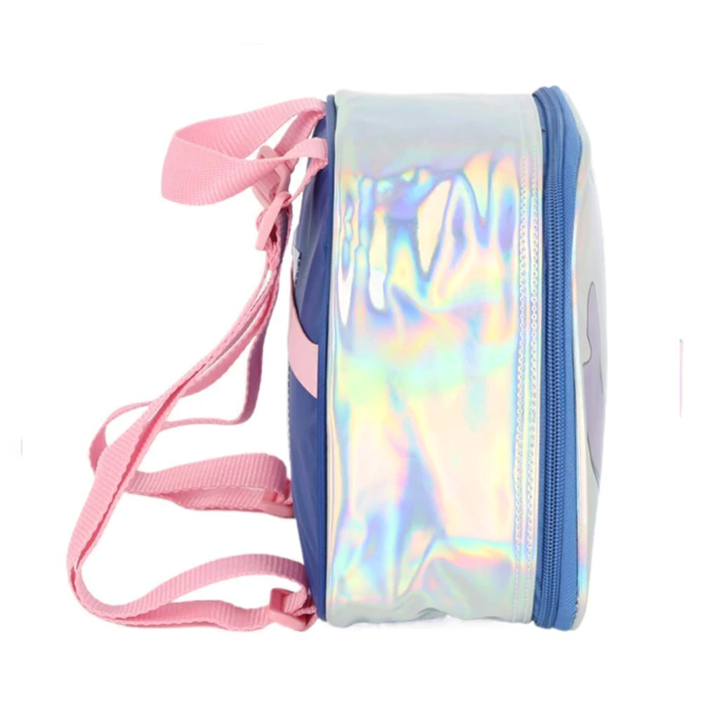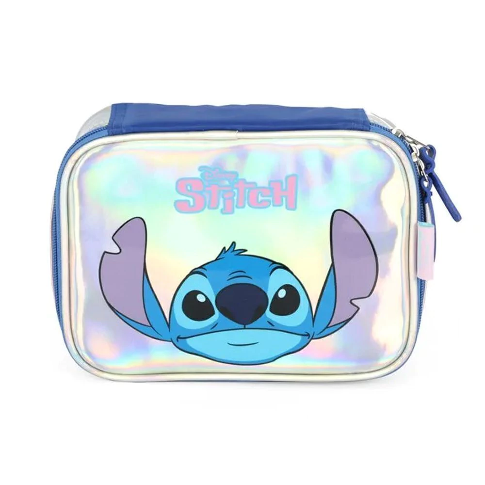 Design holográfico exclusivo do Stitch, que garante um visual moderno e divertido para a escola.