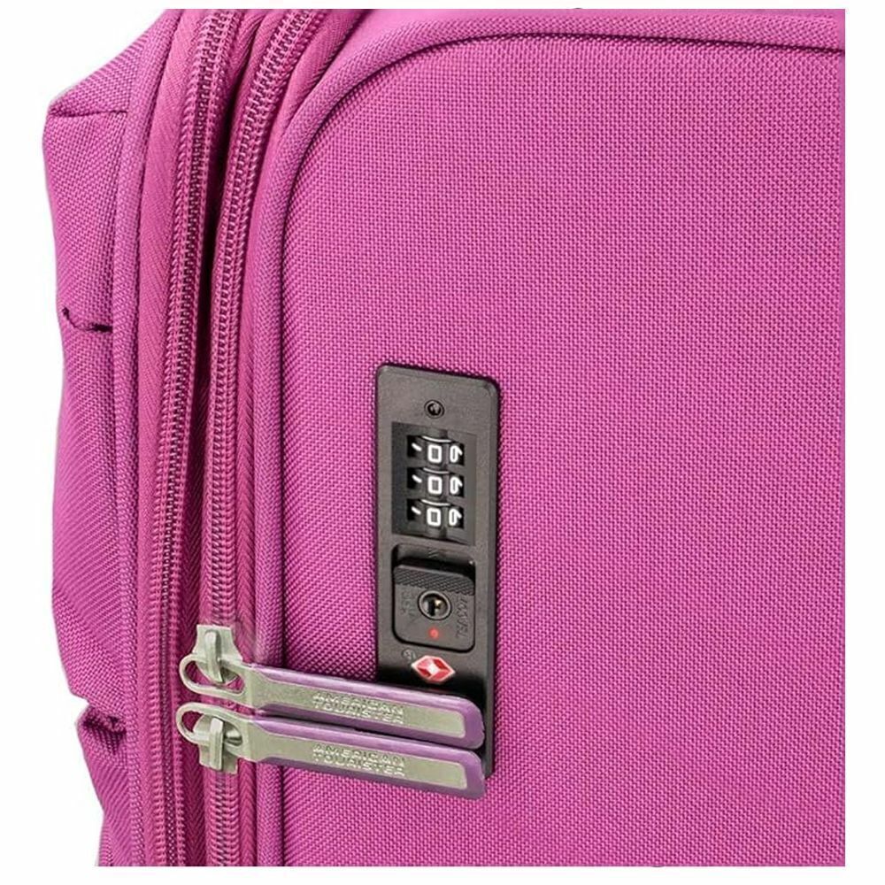 A Mala Média American Tourister New Rio Pink oferece mobilidade suave e segurança para suas viagens, com design expandível e material poliéster reforçado.